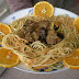 Sirva quente, acompanhado com o Esparguete Tricolor e enfeitado com as rodelas de Laranja que reservou.